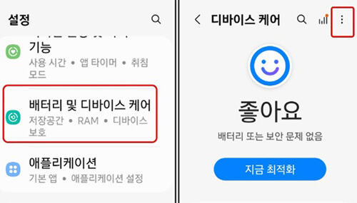 ② 디바이스 케어 접속: 설정 > 디바이스 케어 > ‘최적화’ 클릭