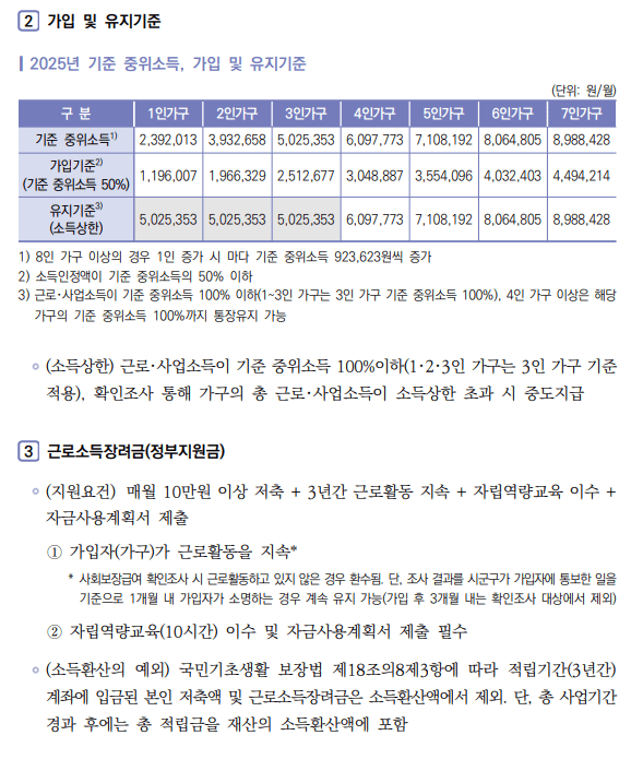 | 가구원 수 | 중위소득 100% | 가입 기준 (50%) | 유지 기준 (150%) |